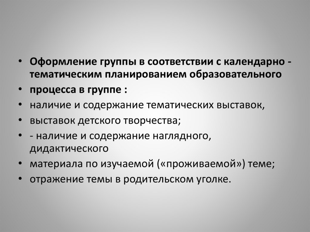 • Оформление группы в соответствии с календарно тематическим планированием образовательного• процесса в группе :