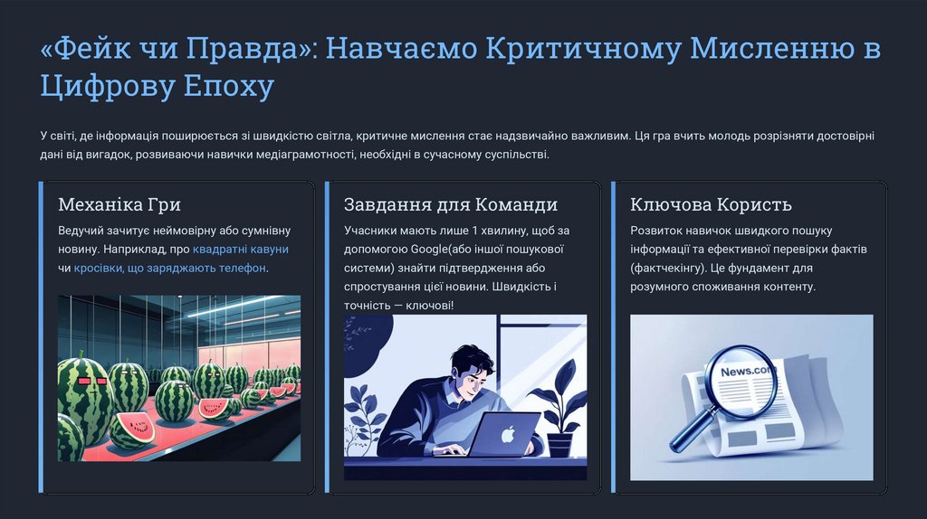 У світі, де інформація поширюється зі швидкістю світла, критичне мислення стає надзвичайно важливим. Ця гра вчить молодь розрізняти достовірні