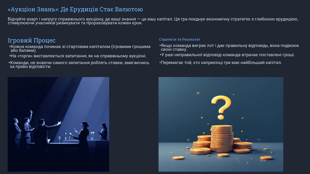 «Аукціон Знань»: Де Ерудиція Стає ВалютоюВідчуйте азарт і напругу справжнього аукціону, де ваші знання — це ваш капітал. Ця гра поєднує економічну стратегію з глибокою ерудицією,