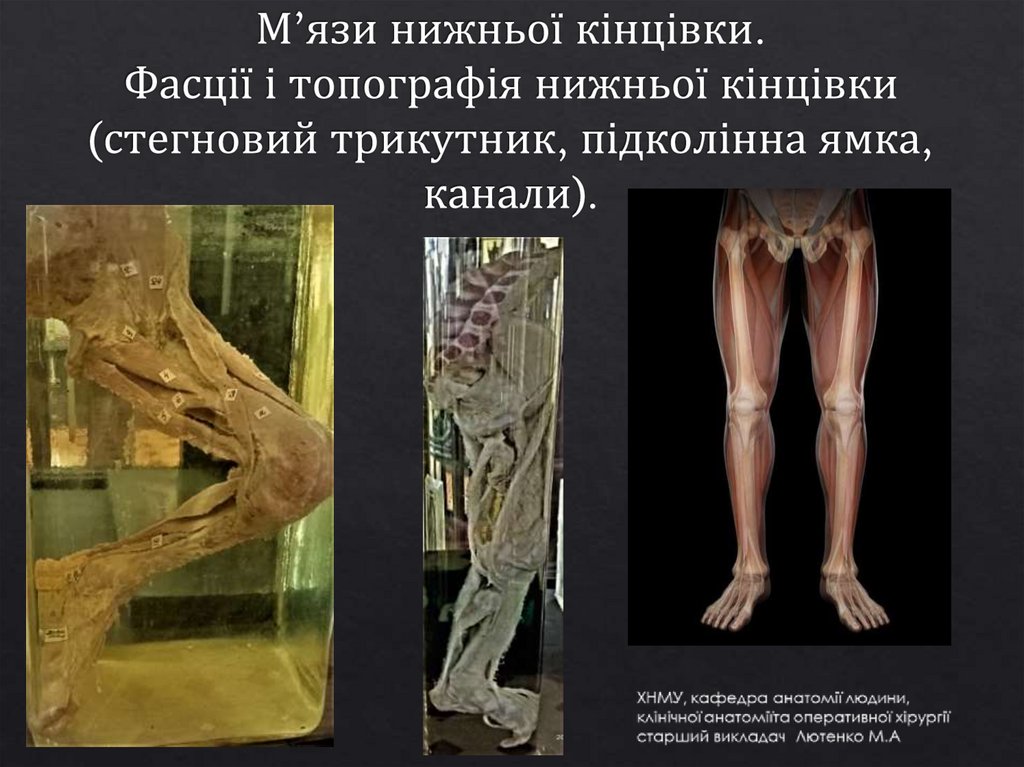 1. М’язи нижньої кінцівки. Фасції і топографія нижньої кінцівки (стегновий трикутник, підколінна ямка, канали).