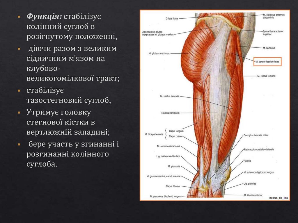 На бічній поверхні стегна широка фасцiя пiдсилюється сухожилками м'яза – натягача