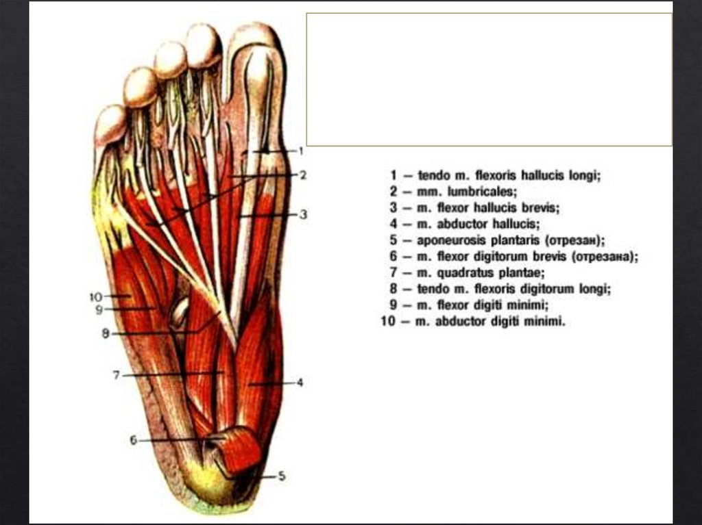 поверхнi стопи, а також тильні мiжкiстковi м’язи.