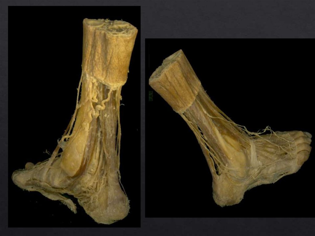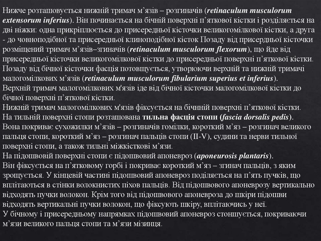 Нижче розташовується нижнiй тримач м’язів – розгиначiв (retinaculum musculorumextensorum inferius). Вiн починається на бічнiй поверхнi п’яткової кiстки i роздiляється на