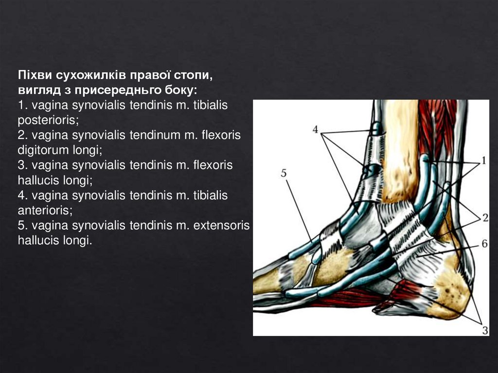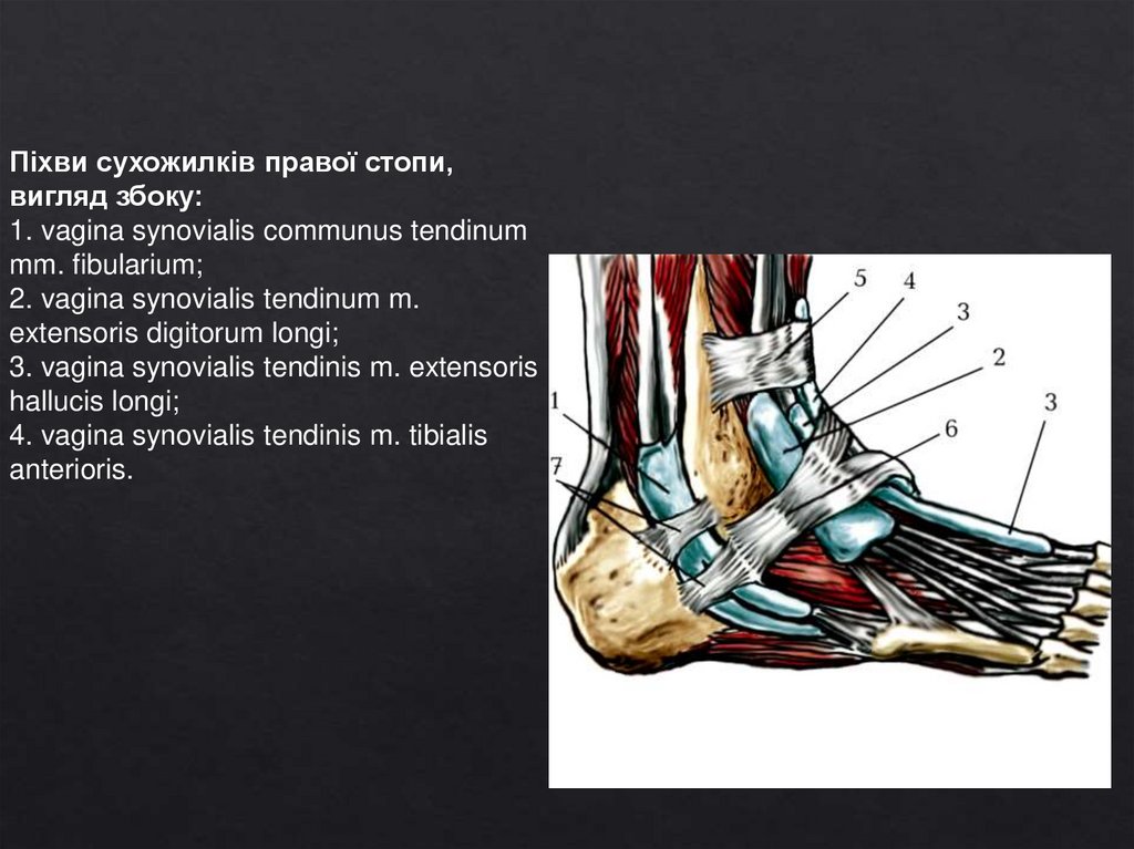 Піхви сухожилків правої стопи,вигляд з присередньго боку: