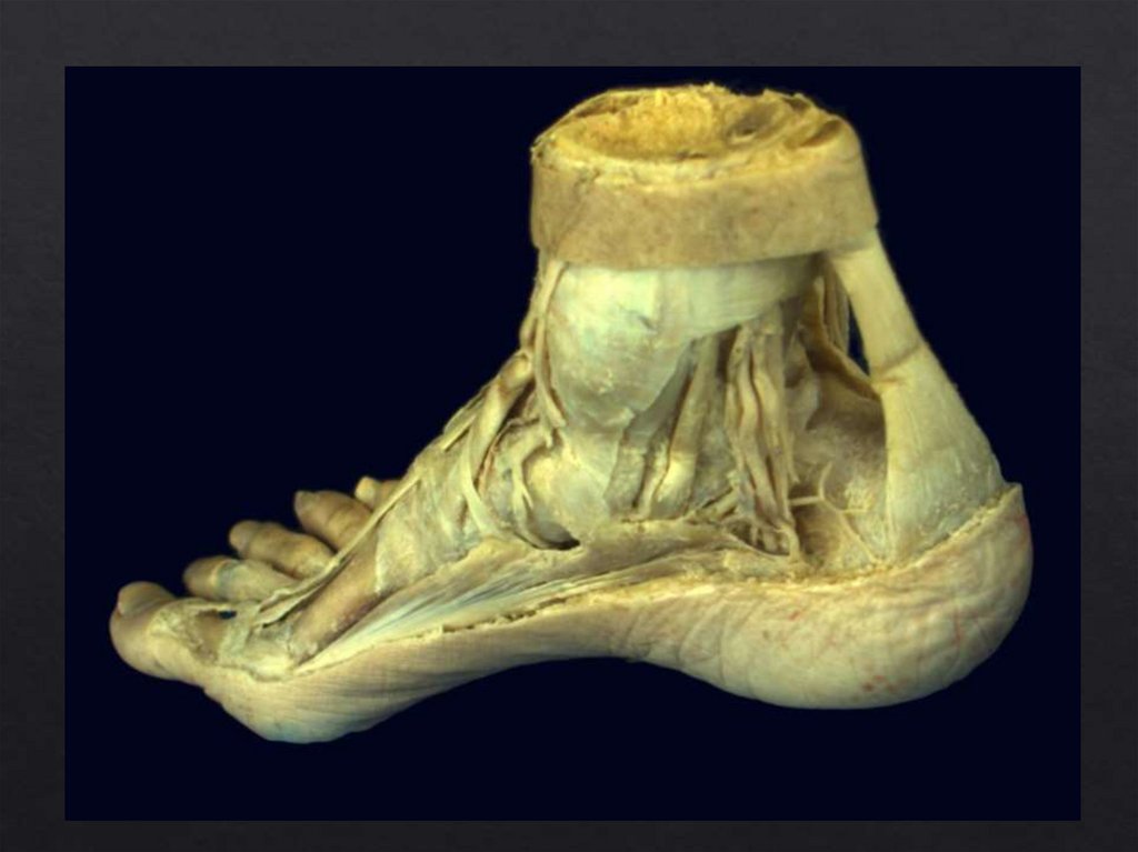 Нижній тримач малогомілкових м'язів фiксується на бічннiй поверхнi п’яткової кiстки.