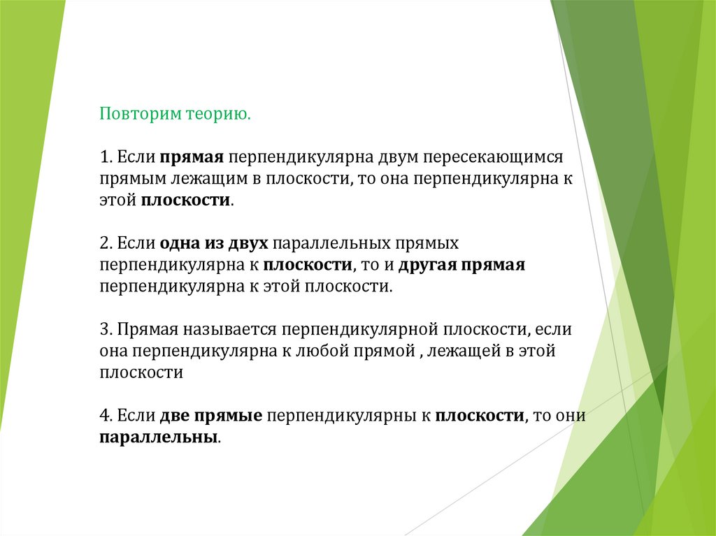 Повторим теорию.1. Если прямая перпендикулярна двум пересекающимся