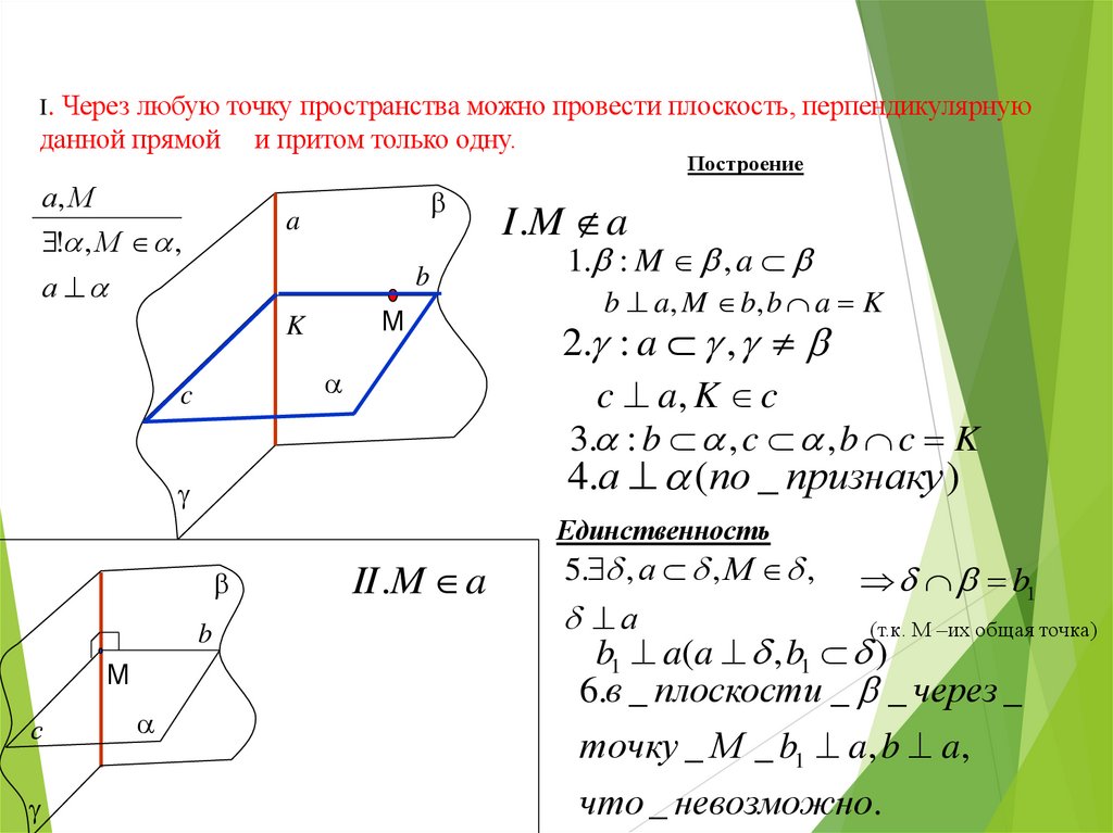 I. Через любую точку пространства можно провести плоскость, перпендикулярнуюданной прямой