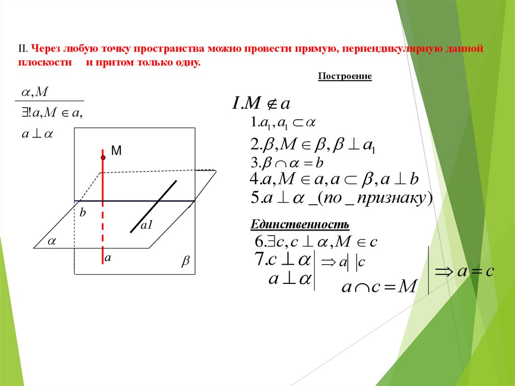 II. Через любую точку пространства можно провести прямую, перпендикулярную даннойплоскости