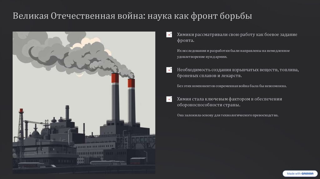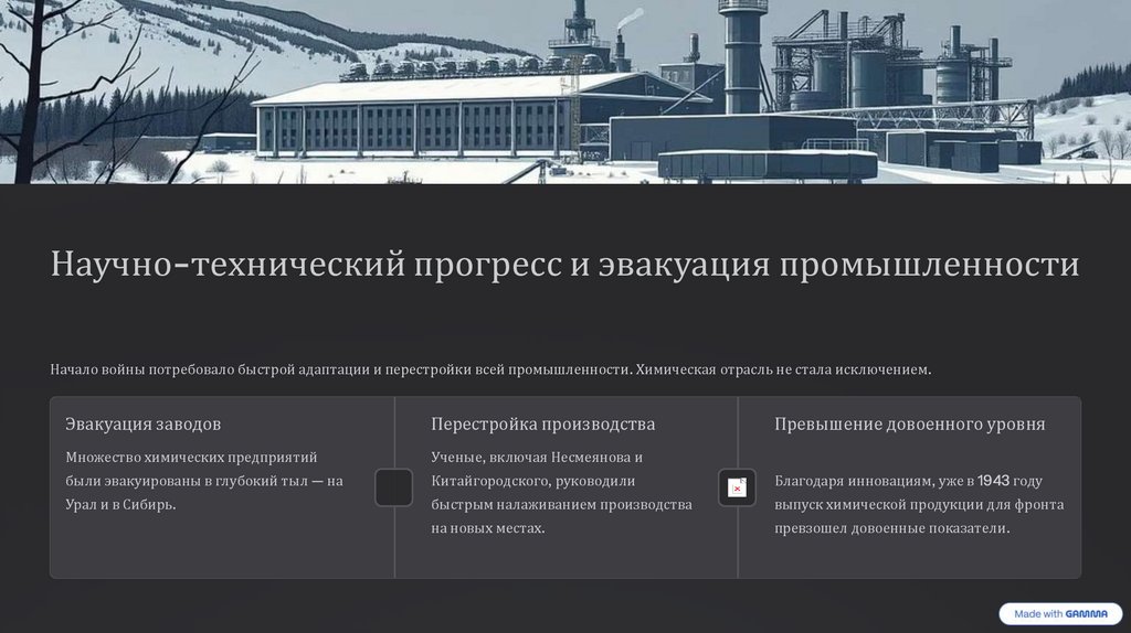Научно-технический прогресс и эвакуация промышленностиНачало войны потребовало быстрой адаптации и перестройки всей промышленности. Химическая отрасль не стала исключением.