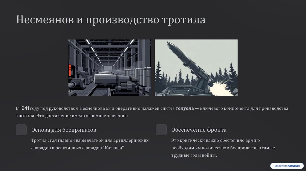 Несмеянов и производство тротилаВ 1941 году под руководством Несмеянова был оперативно налажен синтез толуола — ключевого компонента для производства