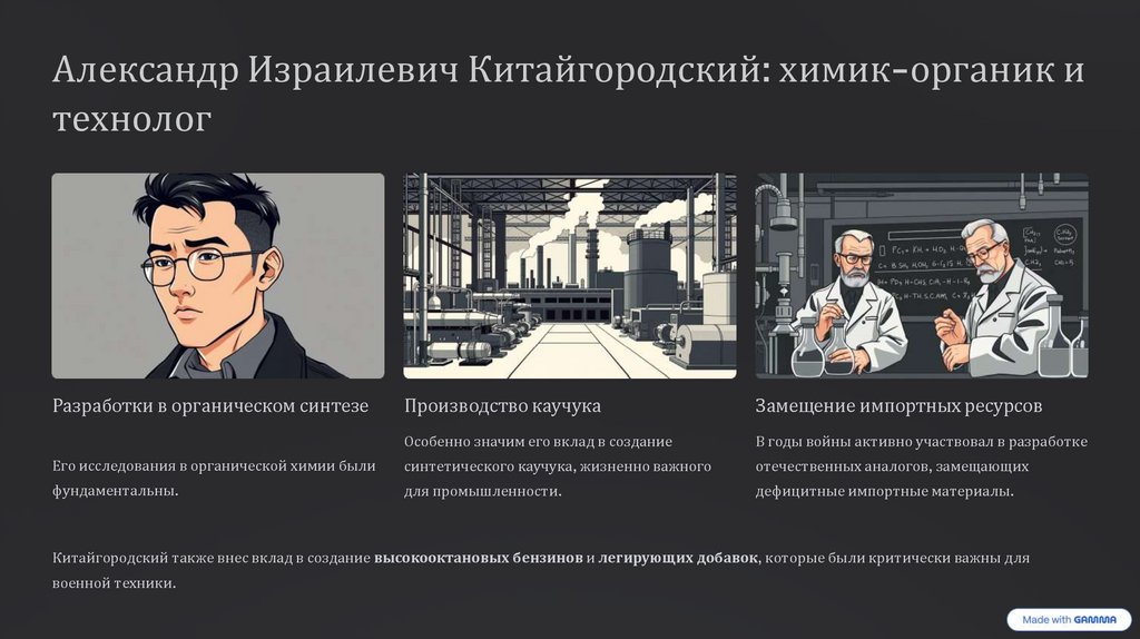 Китайгородский также внес вклад в создание высокооктановых бензинов и легирующих добавок, которые были критически важны для