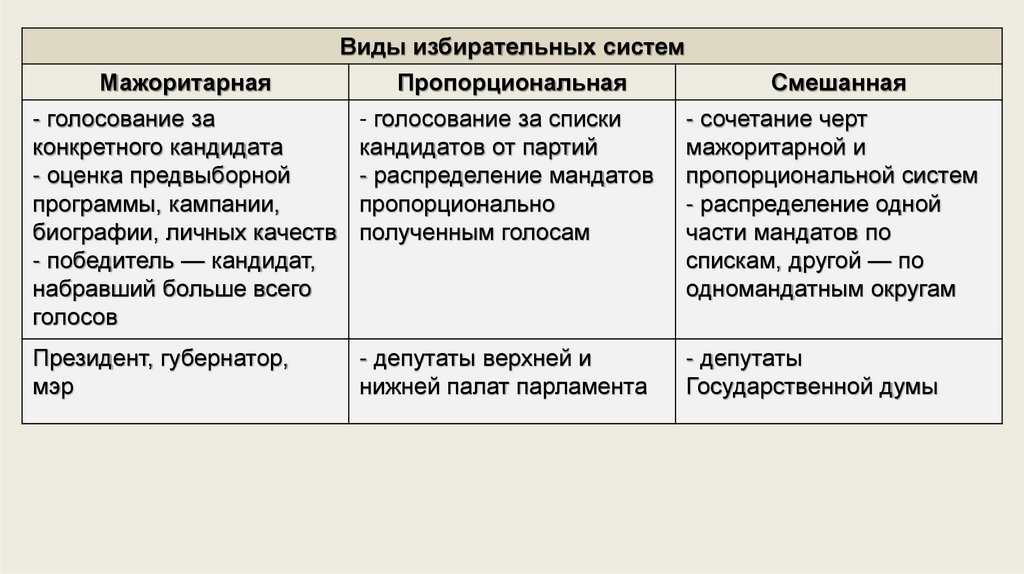 - косвенные — граждане голосуют за выборщиков затем избирают