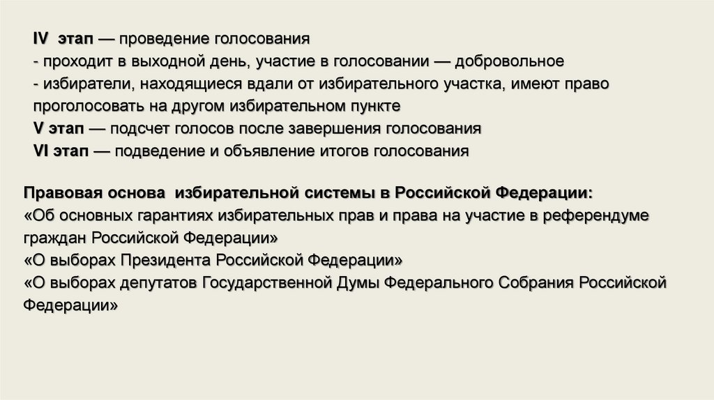IV этап — проведение голосования- проходит в выходной день, участие в голосовании — добровольное