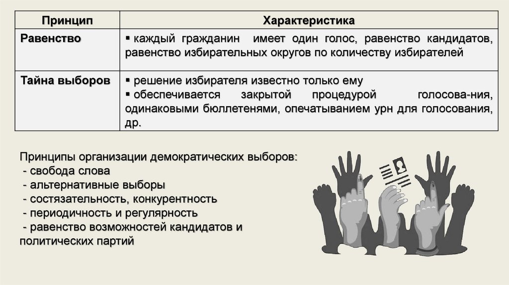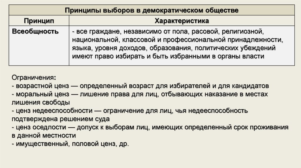 - возрастной ценз — определенный возраст для избирателей и для кандидатов