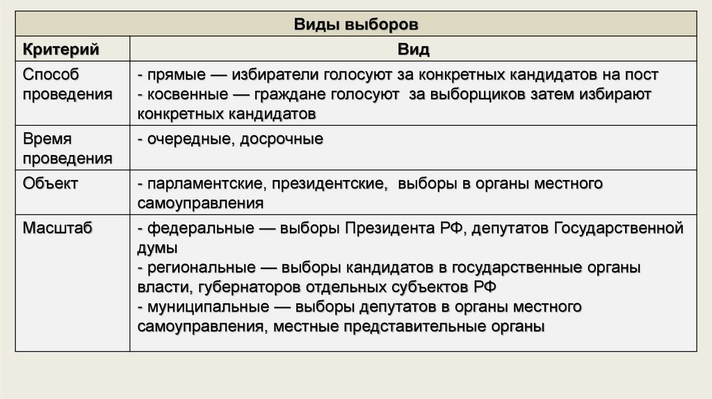 - федеральные — выборы Президента РФ, депутатов Государственной