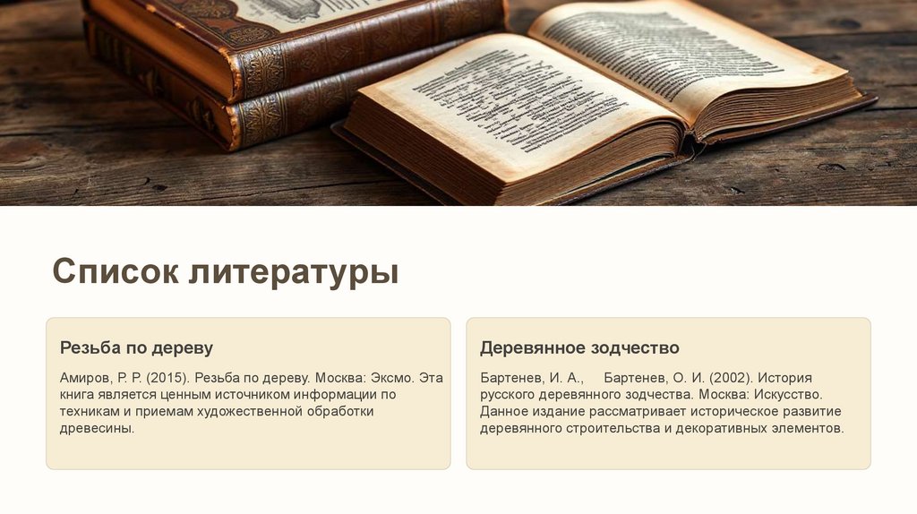 Амиров, Р. Р. (2015). Резьба по дереву. Москва: Эксмо. Эта