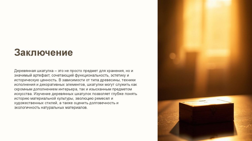 ЗаключениеДеревянная шкатулка – это не просто предмет для хранения, но и