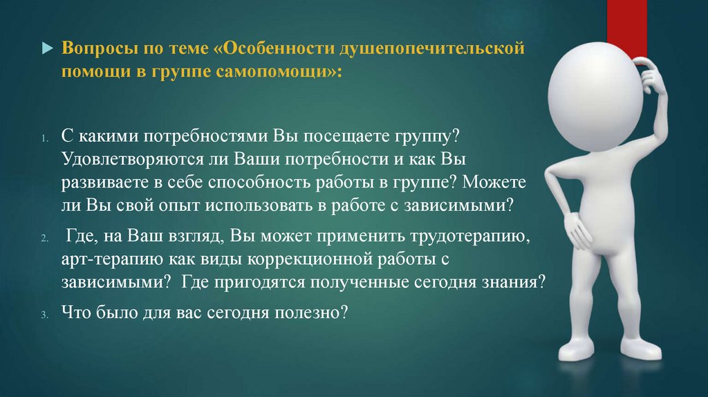 Вопросы по теме «Особенности душепопечительскойпомощи в группе самопомощи»: