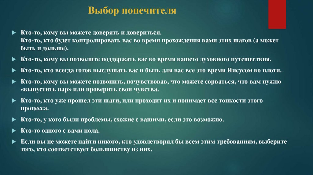 8. БЫТЬ ПОПЕЧИТЕЛЕМ Требования: Заинтересованность и искреннее участие в судьбе исцеляющегося человека. Подразумевается, что вы,