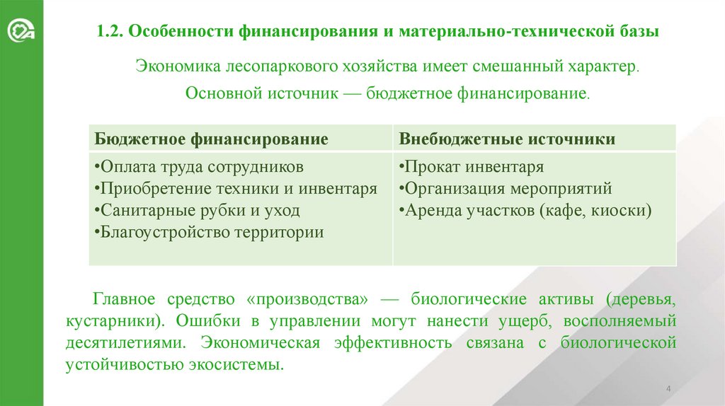 1.2. Особенности финансирования и материально-технической базыЭкономика лесопаркового хозяйства имеет смешанный характер.