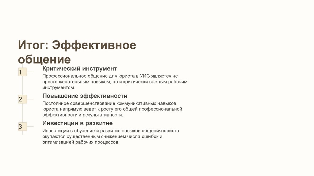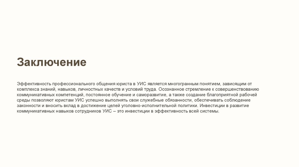 ЗаключениеЭффективность профессионального общения юриста в УИС является многогранным понятием, зависящим от