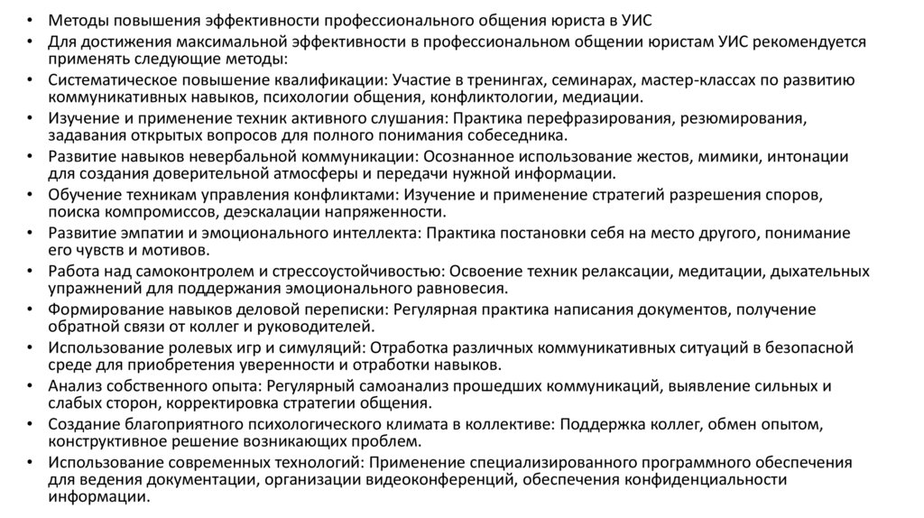 • Методы повышения эффективности профессионального общения юриста в УИС• Для достижения максимальной эффективности в профессиональном общении юристам УИС рекомендуется