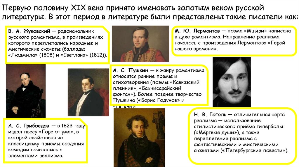 Первую половину XIX века принято именовать золотым веком русскойлитературы. В этот период в литературе были представлены такие писатели как: