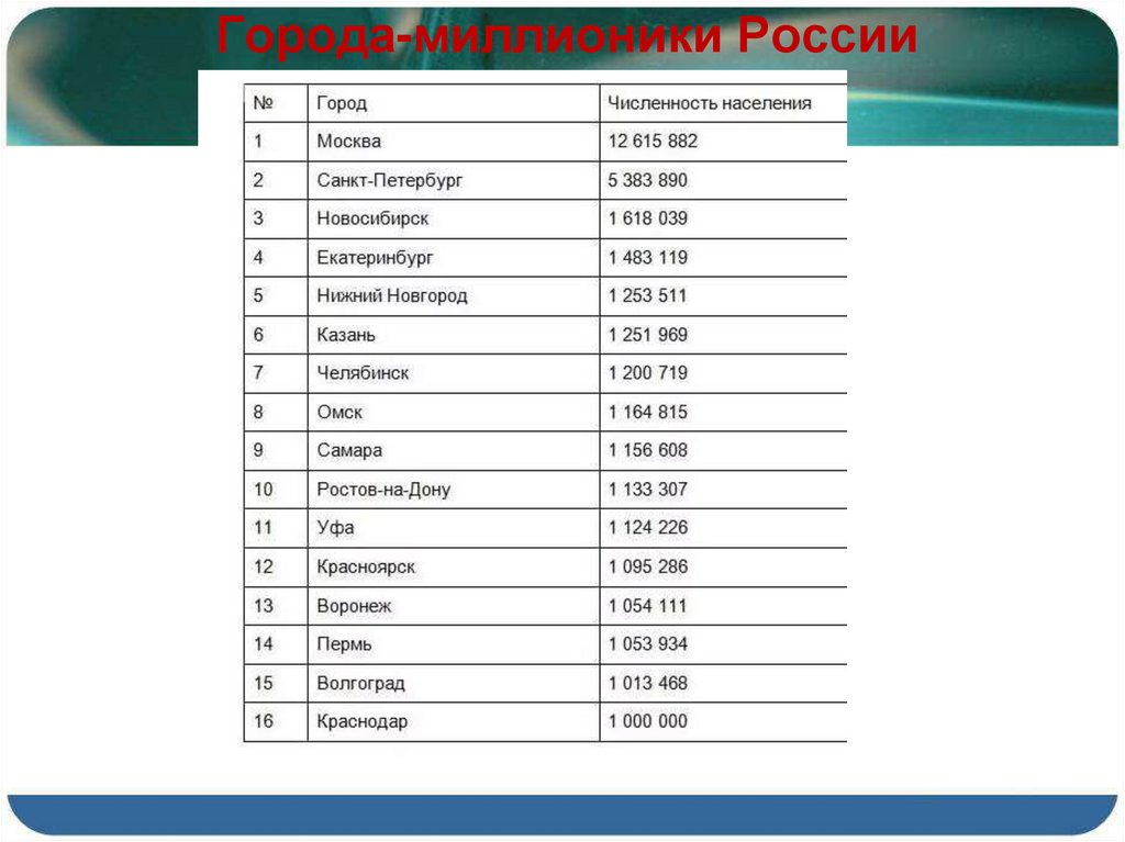 ГОРОДА МИЛЛИОНЕРЫ - 1 млн и более