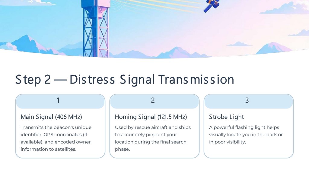 Satellites receive the 406 MHz signal and instantly relay the data to ground stations worldwide.
