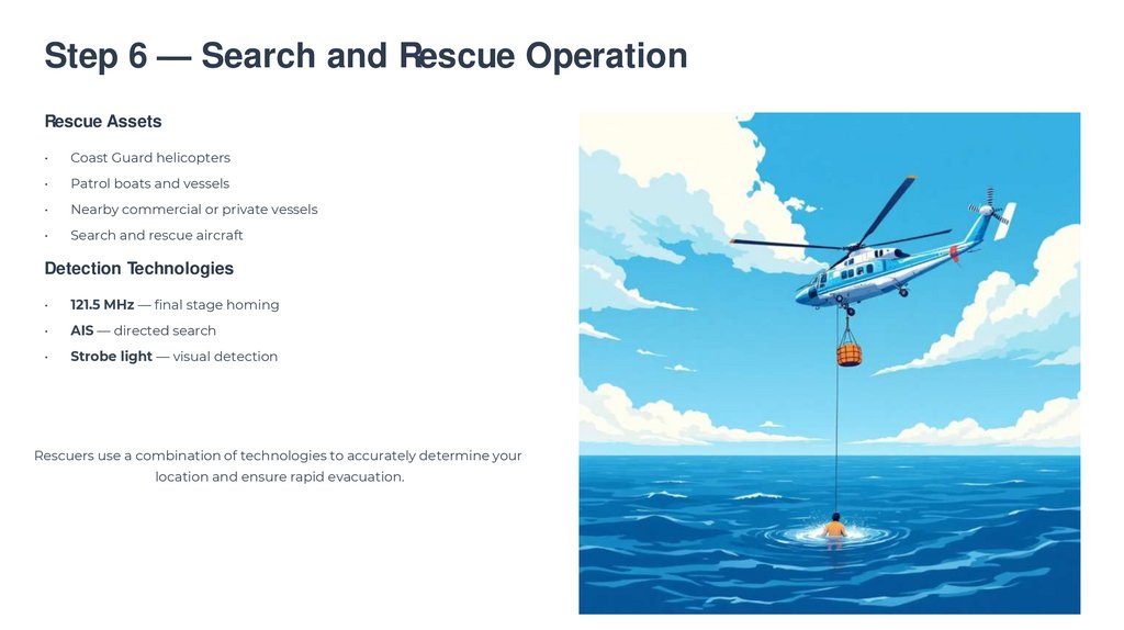 Rescuers use 121.5 MHz homing, AIS, and visual strobe search for
