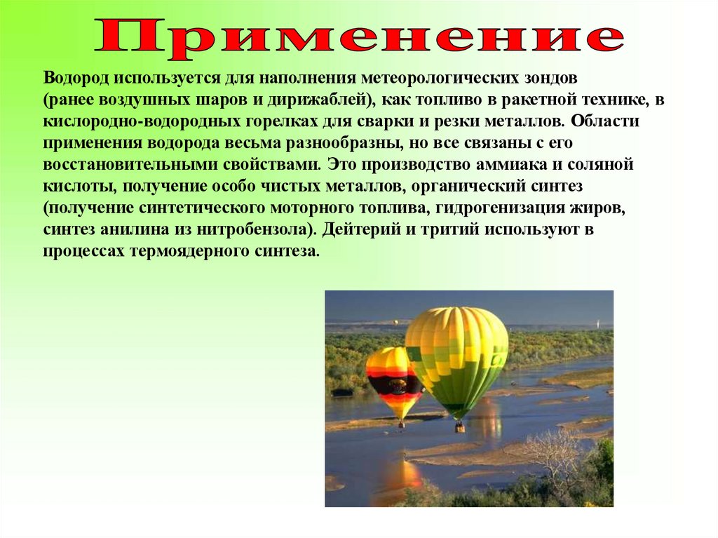 Водород используется для наполнения метеорологических зондов(ранее воздушных шаров и дирижаблей), как топливо в ракетной технике, в