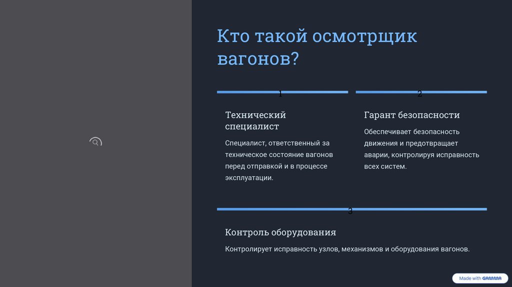Контролирует исправность узлов, механизмов и оборудования вагонов.