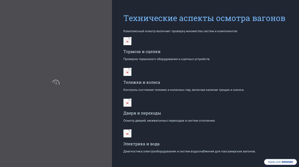 Технические аспекты осмотра вагоновКомплексный осмотр включает проверку множества систем и компонентов: