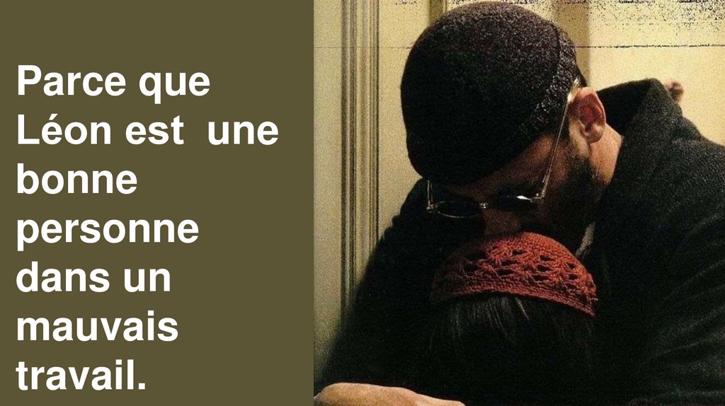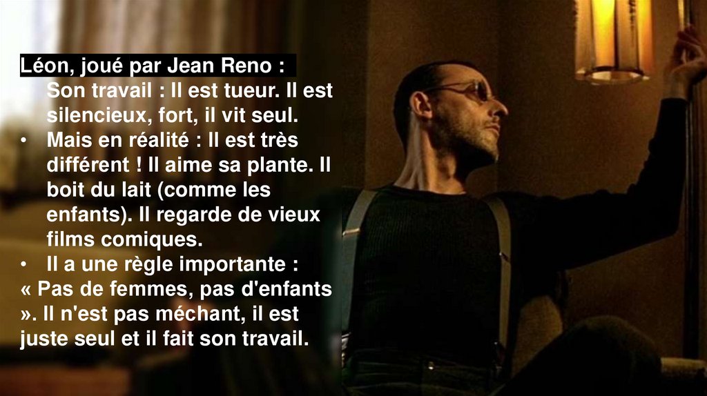 Léon, joué par Jean Reno :• Son travail : Il est tueur. Il est