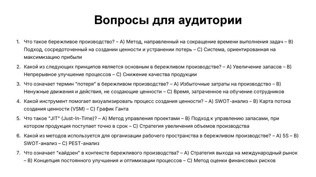 Вопросы для аудитории1. Что такое бережливое производство? – A) Метод, направленный на сокращение времени выполнения задач – B)