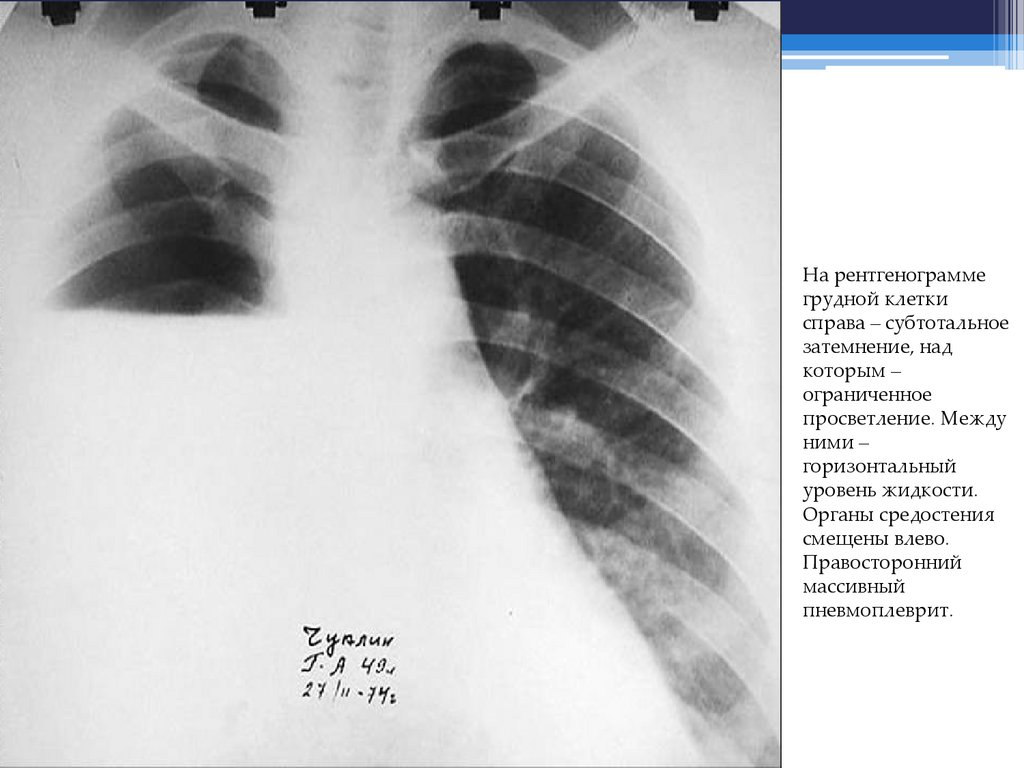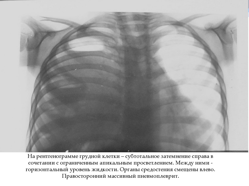 На рентгенограмме грудной клетки – субтотальное затемнение справа всочетании с ограниченным апикальным просветлением. Между ними горизонтальный уровень жидкости. Органы средостения смещены влево.