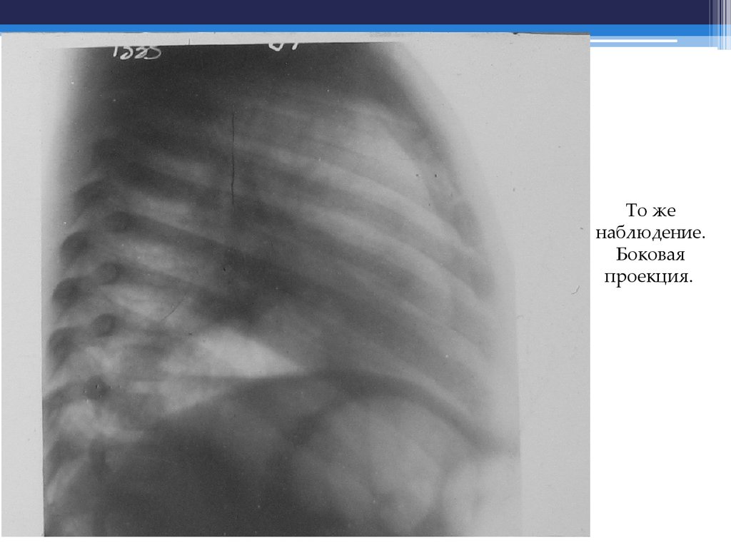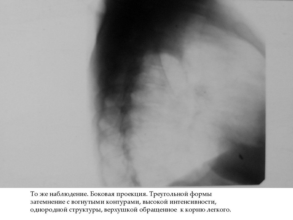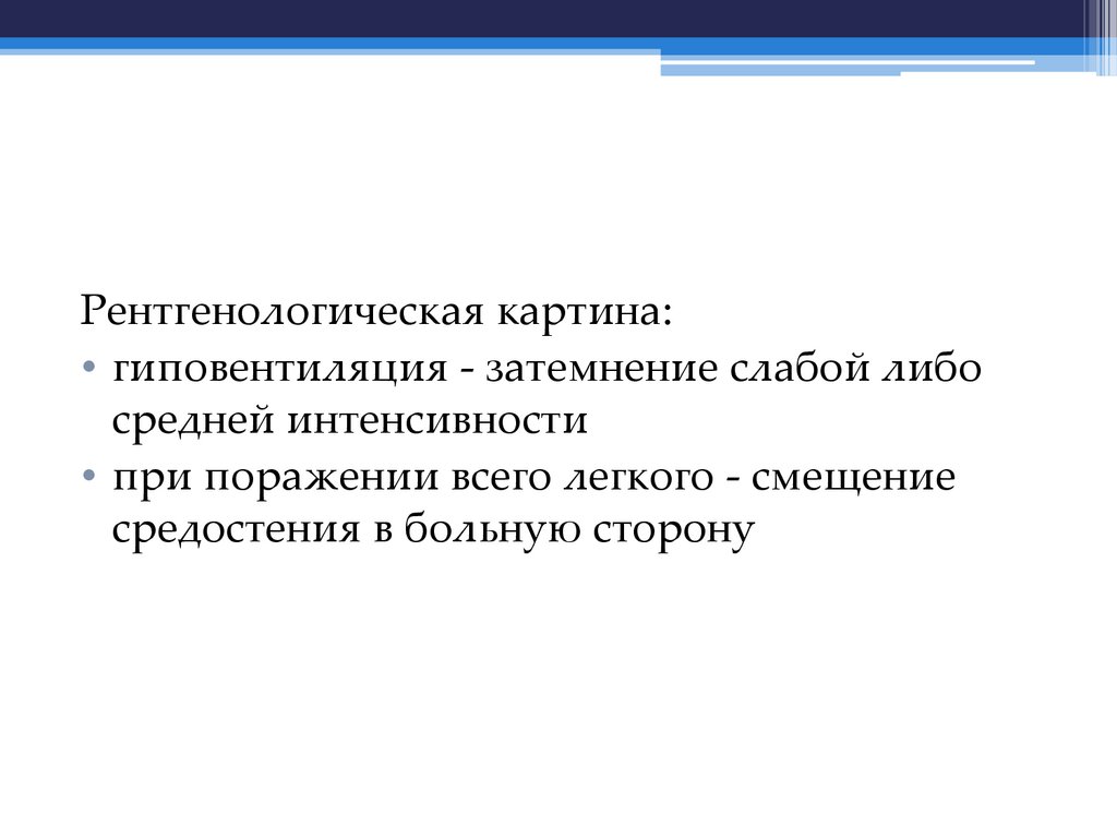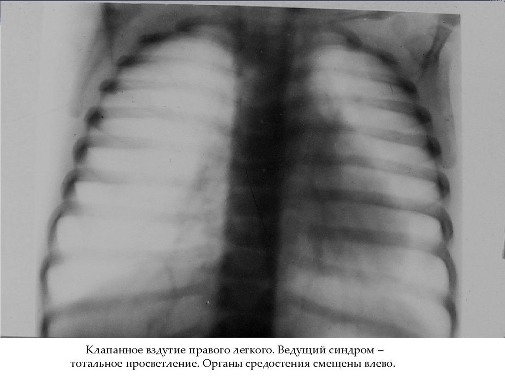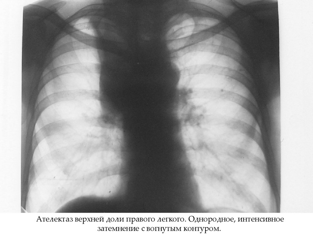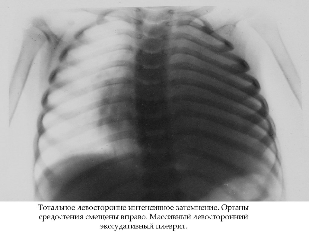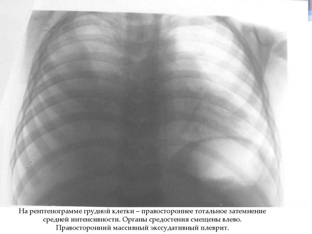 На рентгенограмме грудной клетки – правостороннее тотальное затемнениесредней интенсивности. Органы средостения смещены влево.