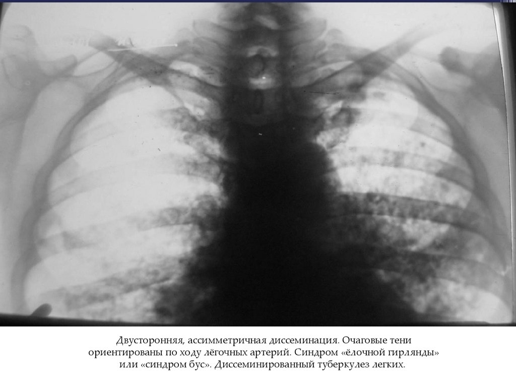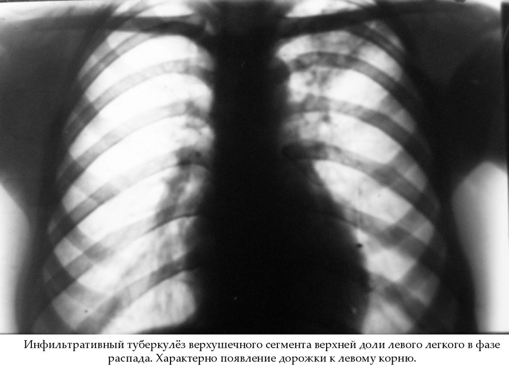 Инфильтративный туберкулёз верхушечного сегмента верхней доли левого легкого в фазераспада. Характерно появление дорожки к левому корню.