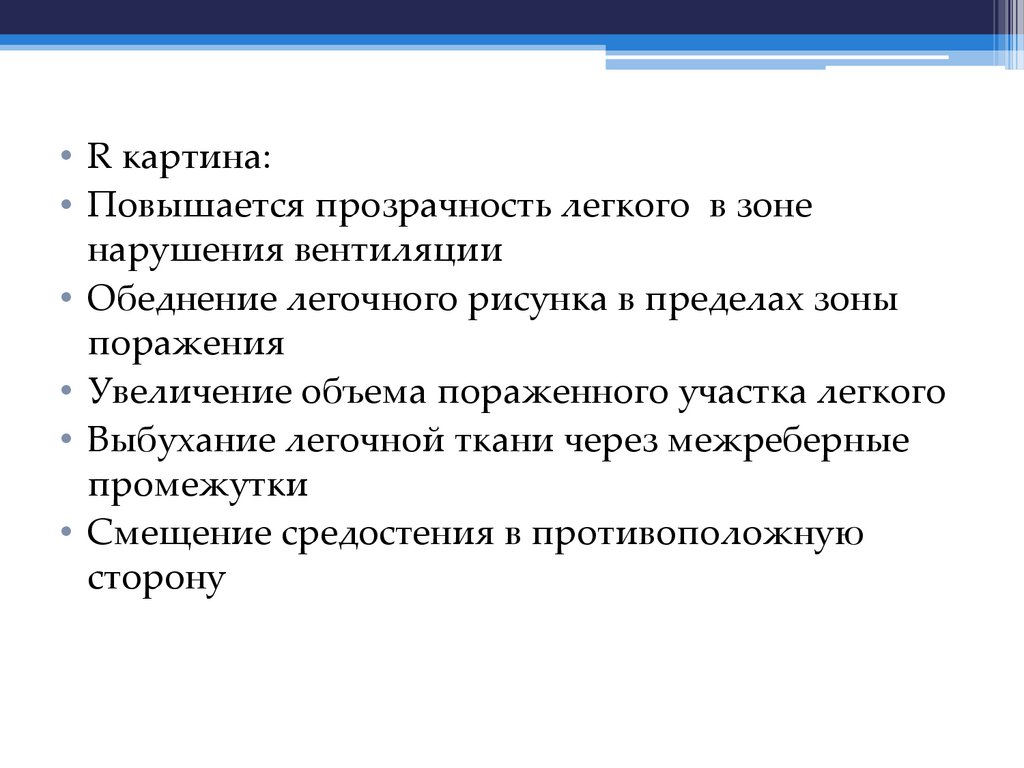 • Характеризуется синдромом просветления сотсутствием на его фоне легочного рисунка