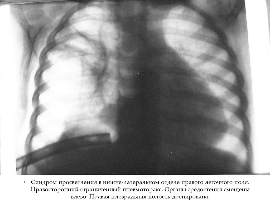 • Синдром просветления в нижне-латеральном отделе правого легочного поля.Правосторонний ограниченный пневмоторакс. Органы средостения смещены