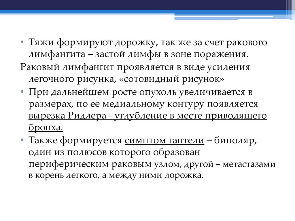 • Тяжи формируют дорожку, так же за счет раковоголимфангита – застой лимфы в зоне поражения.