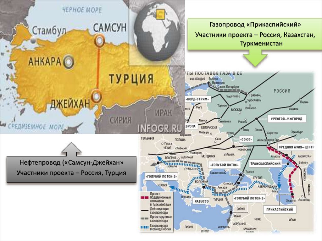 11. В обход России построен нефтепровод «Баку-Тбилиси-Джейхан» (2006 г.). Проект финансировали США, Турция, Грузия, Азербайджан