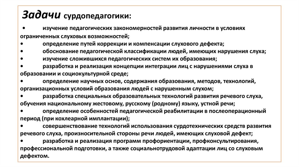 Задачи сурдопедагогики:изучение педагогических закономерностей развития личности в условиях