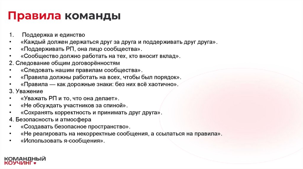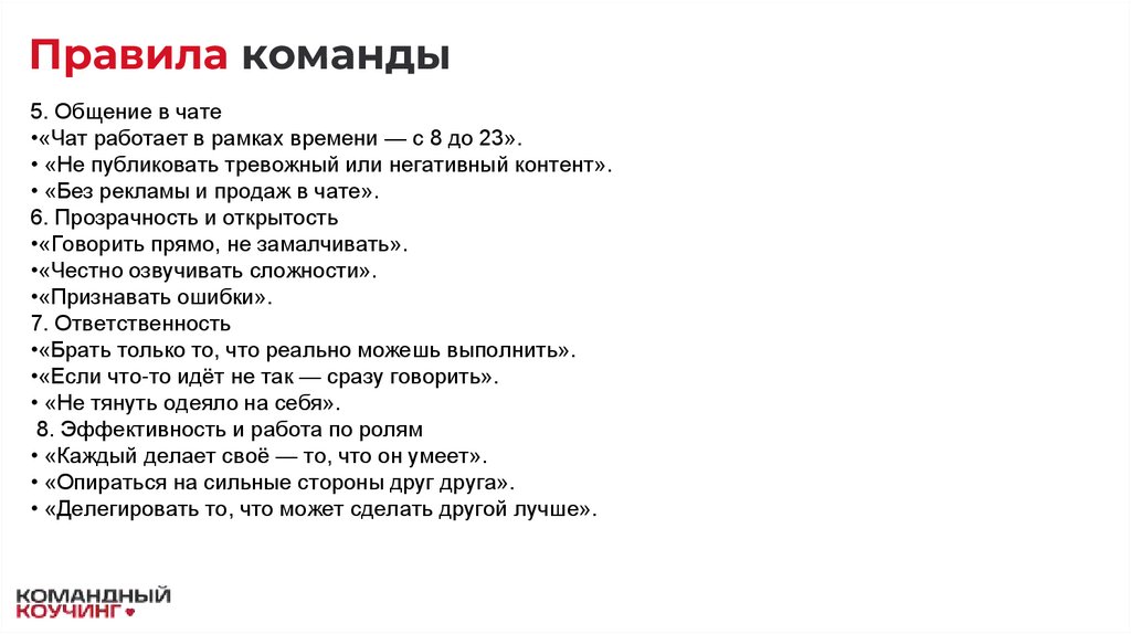 •5. Мы не жалуемся на людей и не обсуждаем участников за их спиной. Если возник вопрос — решаем мягко и напрямую.