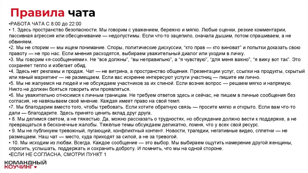 •6. Мы уважительно относимся к личным границам. Не требуем ответов здесь и сейчас, не пишем в личные сообщения без