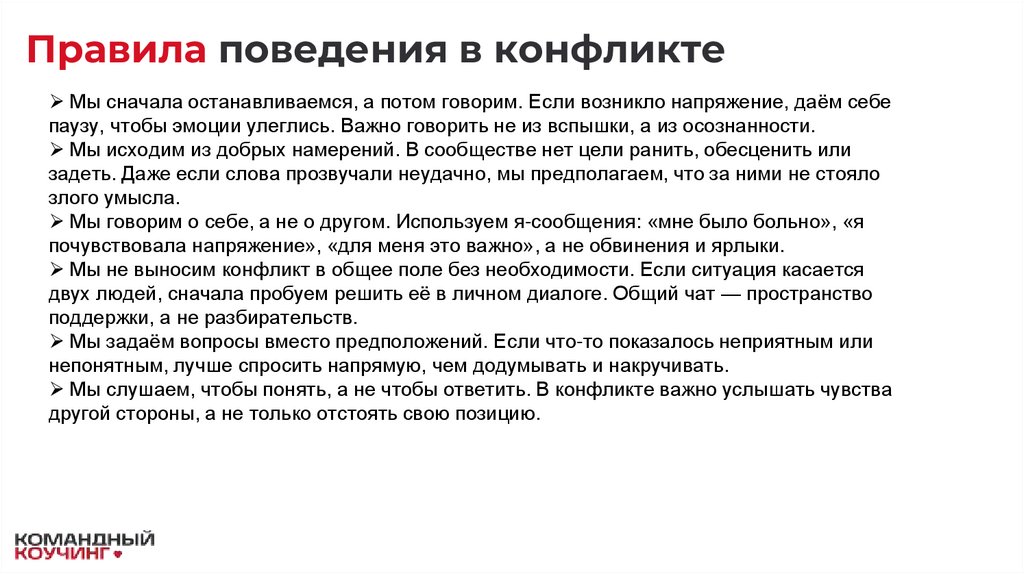 Правила поведения в конфликтеМы сначала останавливаемся, а потом говорим. Если возникло напряжение, даём себе