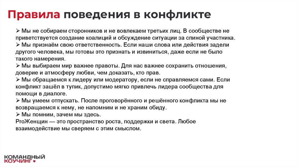 Правила поведения в конфликтеМы не собираем сторонников и не вовлекаем третьих лиц. В сообществе не