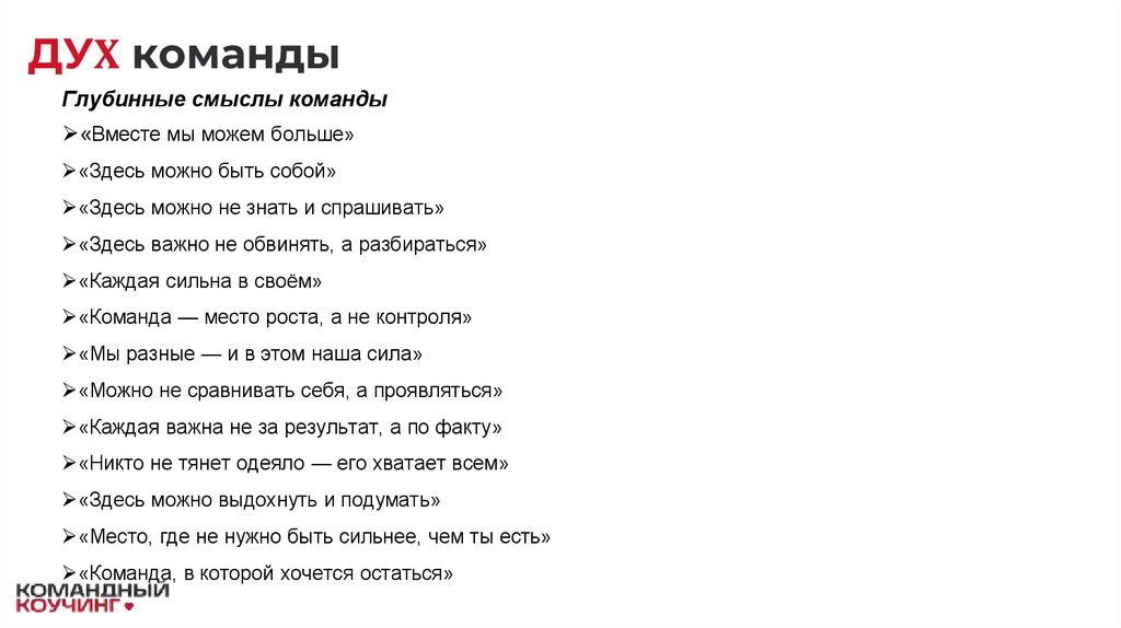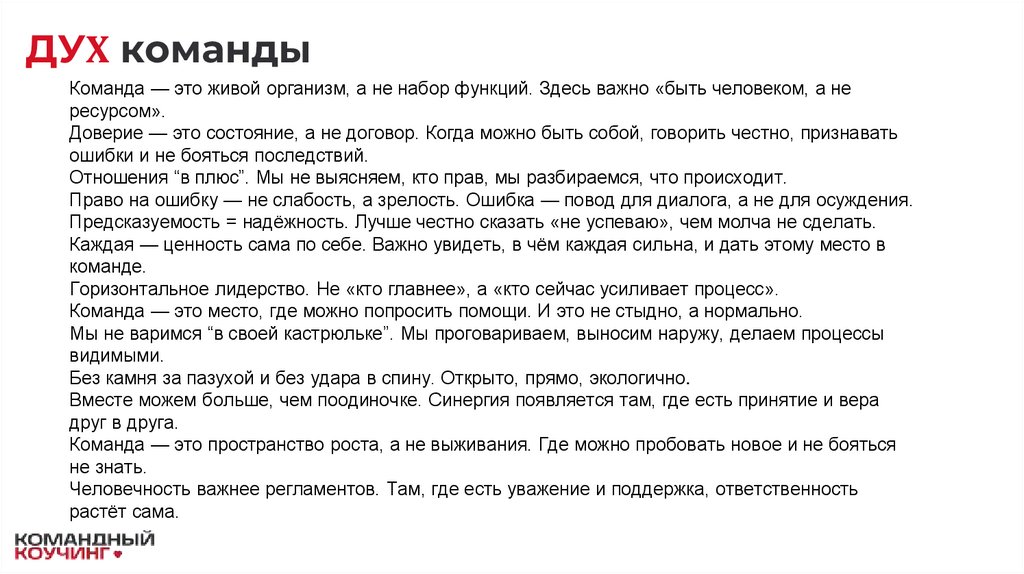 ДУХ командыКоманда — это живой организм, а не набор функций. Здесь важно «быть человеком, а не