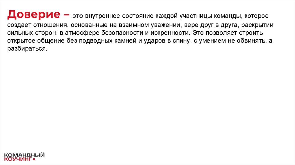 Доверие – это внутреннее состояние каждой участницы команды, котороесоздает отношения, основанные на взаимном уважении, вере друг в друга, раскрытии