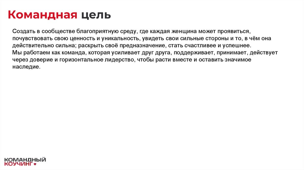 Командная цельСоздать в сообществе благоприятную среду, где каждая женщина может проявиться,